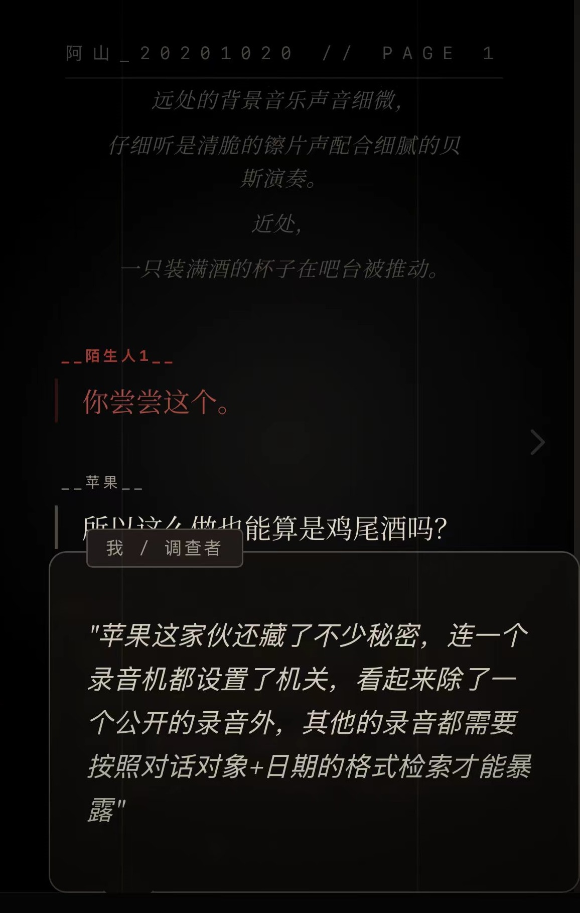 游戏的叙事氛围以及剧情沉浸感直接拉满,采用了黑白胶片美学和复古酒吧的设定,拥有很强的代入感。采用了三线线索交叉验证的方式,就如同在看一本非常严谨的短篇推理小说一般,最后结局需要自行回味分析,拥有很强的后劲。所以即使剧情只有2.5小时左右,但依然有着极为丰富的内容,实际沉浸时间远不止这些。游戏整体难度适中,关键词会有适当标记线索,采用自动记录方式,无需重复检索。但是有些照片密码有抽象设定,需要多多留意,其余的都是逻辑闭环,并没有强行误导设定,这对于新手玩家来说非常友好。