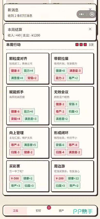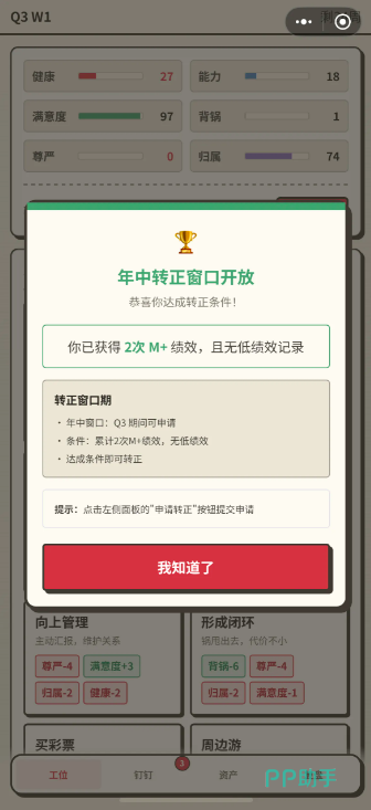 日常的牛马人生在线上又开始二次体验,大厂外包工作模拟器让你做线上牛马,创造“扶墙”人生,通过简单的文字模式来对外包工作的过程进行趣味汇总,每一次招聘到工资猛涨,再到成为公司借的高管,还原更加不一样的外包工作人生,究竟是职场得意,还是遭人算计,谁也不知道最终结局的走向。作品中还加入了不少的创意养成玩法,从自身的健康指数,工资收益到老板的满意度,以及对能力的各种评价,统统以数据模式向玩家们反馈,让你的职场价值直观展现。