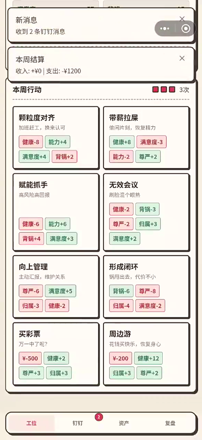 公司定期还会举行周目考核,每周目考核失败大结局也会走向不一样的方向,笨蛋员工那一周到底又做了些什么呢?小小提示一下,如果一周都在干同一件事,虽然有自由度的提升,但是老板可会扣你工资哦!