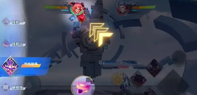 咒焰旋风释放后,安琪拉会在原地留下火种,然后自己跳到高处,落下来踩到火种之后还能再弹跳一次。这个技能可以在空中使用来放置火种,利用方式挺多,比如先虚晃一跳吸引对手靠近,再在空中把火种放到主要位置,把对手引到场地边缘的空中来打,最后让他自己踩空掉出去,用好了很有迷惑性。破晓技爆焰新星,是往前方打出一颗爆弹,命中之后,触发爆炸,因为是远程出手,和一些近战系英雄的破晓技比起来,单次伤害会低一些,主要用途是在对手击飞值已经很高的时候,作为收割手段来打出去,把对手送出场外。