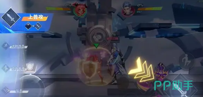 普攻是连续打三下,对着近距离的敌人用效果不错,当对手已经逼过来的时候,用普攻抢先打出去是比较合适的选择。往上滑方向键再按普攻,安琪拉会在空中甩出一条火焰弧线,能打到上方和斜前方的敌人,不过要注意一点,如果对面英雄的体型比较小,站在正前方的话,这个上普攻是打不到的,实际打的时候要留意一下。在冲刺状态里按普攻能打出冲刺攻击,不过安琪拉冲刺的移动速度比较慢,和其他英雄比起来差距还挺明显,这点在实战里要心里有数。