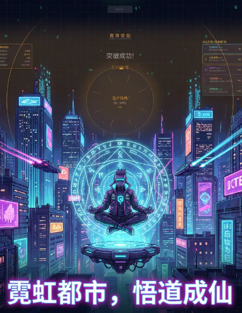 游戏背景设定于霓虹闪烁的赛博都市,传统修仙的“灵气”被替换为数据流,修仙者通过代码感知、芯片共鸣、量子融合等手段突破境界,最终追求永恒编码这个至高境界,这种设定不仅打破了传统修仙框架,更是把东方玄学与未来科技无缝衔接。