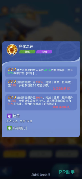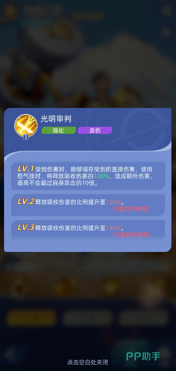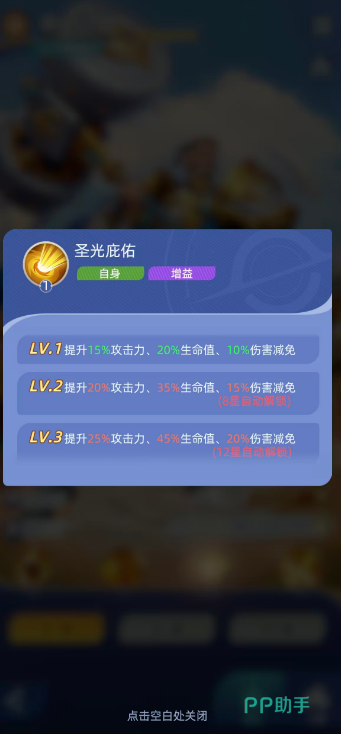 “圣光庇佑”作为被动增益技能,初始提供15%攻击力、20%最大生命值及10%伤害减免三项加成。技能升至满级(3级)后,对应增幅分别提升至25%、45%与20%。该等级解锁条件为角色升至12星,建议玩家在资源允许前提下优先完成此阶段突破,以最大化其坦度与输出潜力。