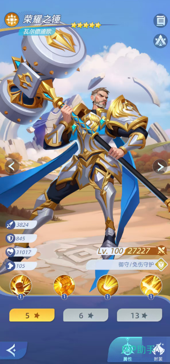 他的主动技能“荣耀之锤”以精准控制见长:首回合即可对敌方攻击力最高的单位发动单体打击,造成283%物理伤害,并有60%概率附加眩晕效果。该技能升至3级后,伤害提升至396%,眩晕触发概率同步提高至90%;若目标当前生命值高于75%,还将额外造成相当于瓦尔德迪欧自身攻击力140%的追加伤害。与此同时,施放成功后可为自身提供防御力增益,显著强化其前排站桩能力。