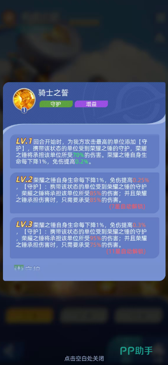 “骑士之誓”是瓦尔德迪欧的核心守护技,在每回合开始时自动生效,为目标队伍中攻击力最高的友方单位施加不可驱散的守护状态。处于该状态下的单位所受95%的伤害将由瓦尔德迪欧承担;同时,每当瓦尔德迪欧自身生命值降低1%,其免伤率即提升0.2%——该系数在角色升至11星后增强至0.3%。这一机制使其在持续承伤过程中越战越稳,极大延长了团队整体续航时间。