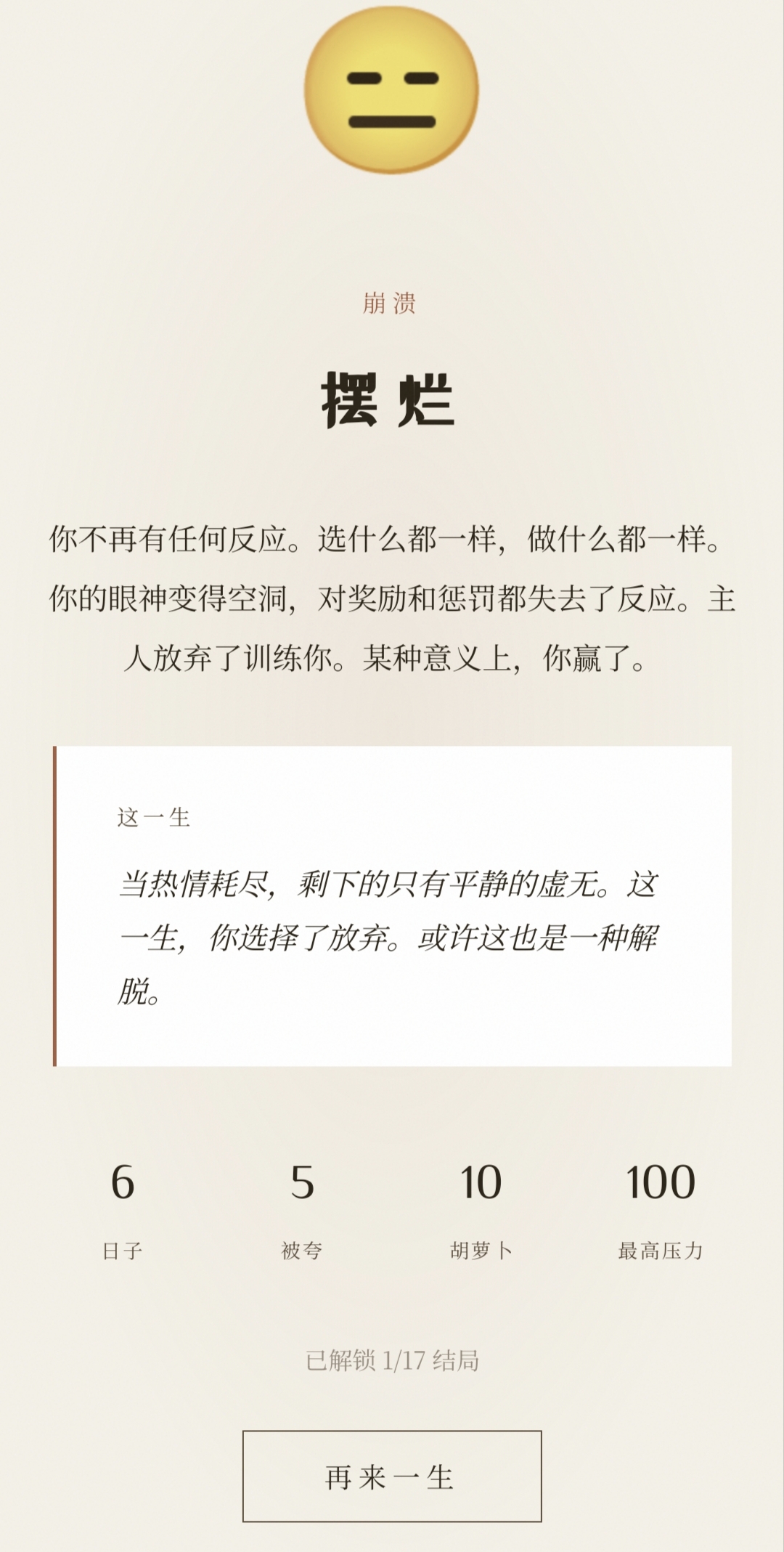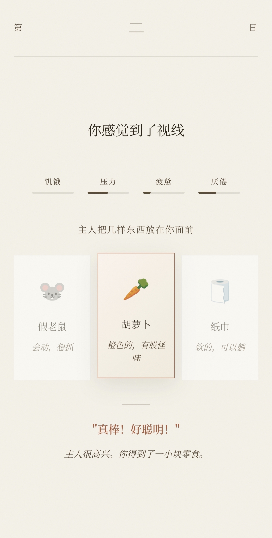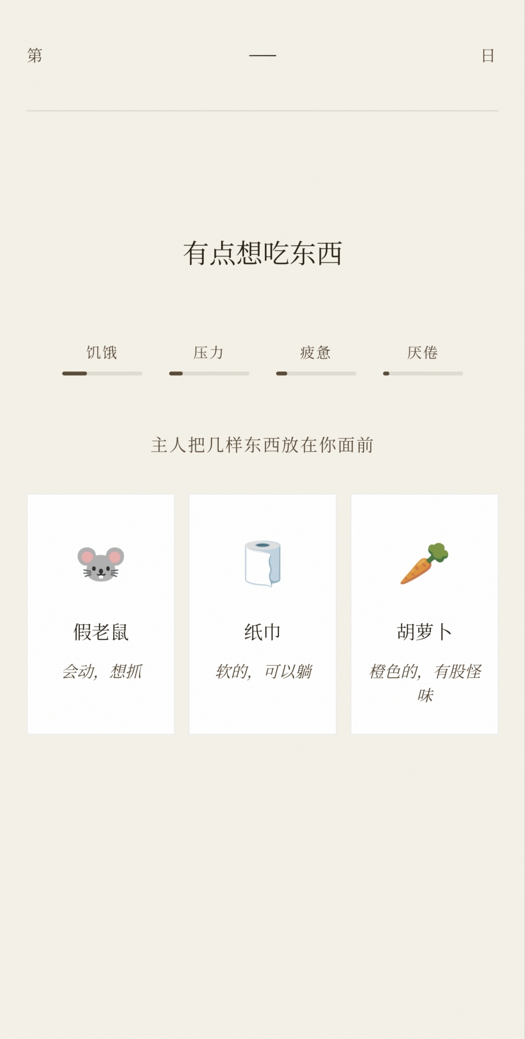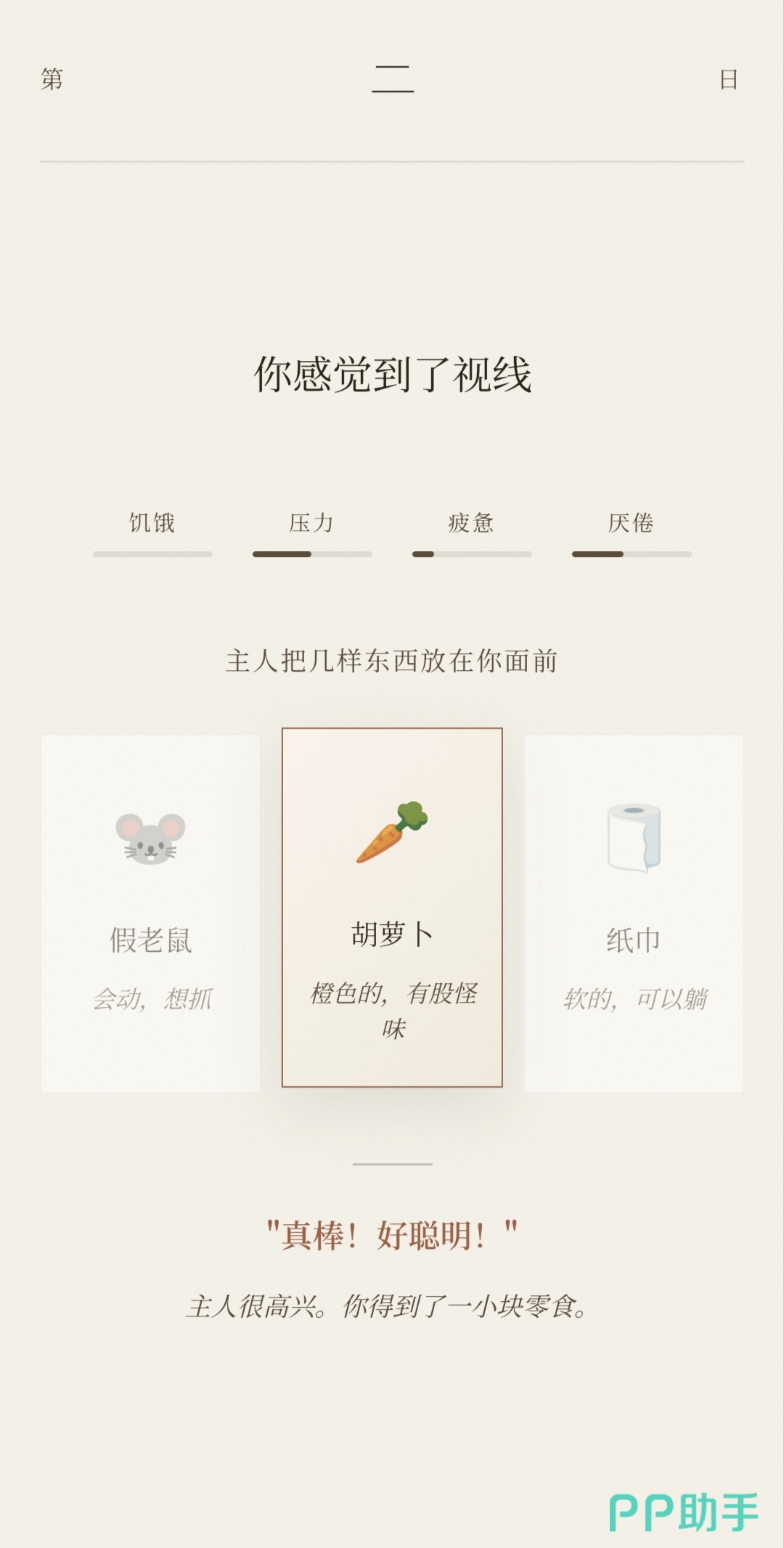 第三个是劳累值数也就是压力值数,在挑选的物品里面,玩家若为主人挑选镜子和红点这些东西,就会大大提高压力值数,这个时候玩家就可以选择纸箱及毛毯,从而来降低猫咪疲劳的指数,以上的三种状态,倘若玩家不及时得到解决和缓解,就会影响猫咪角色的生命力,无法再为玩家选择物品,玩家就会在游戏挑战中面临失败者结果。