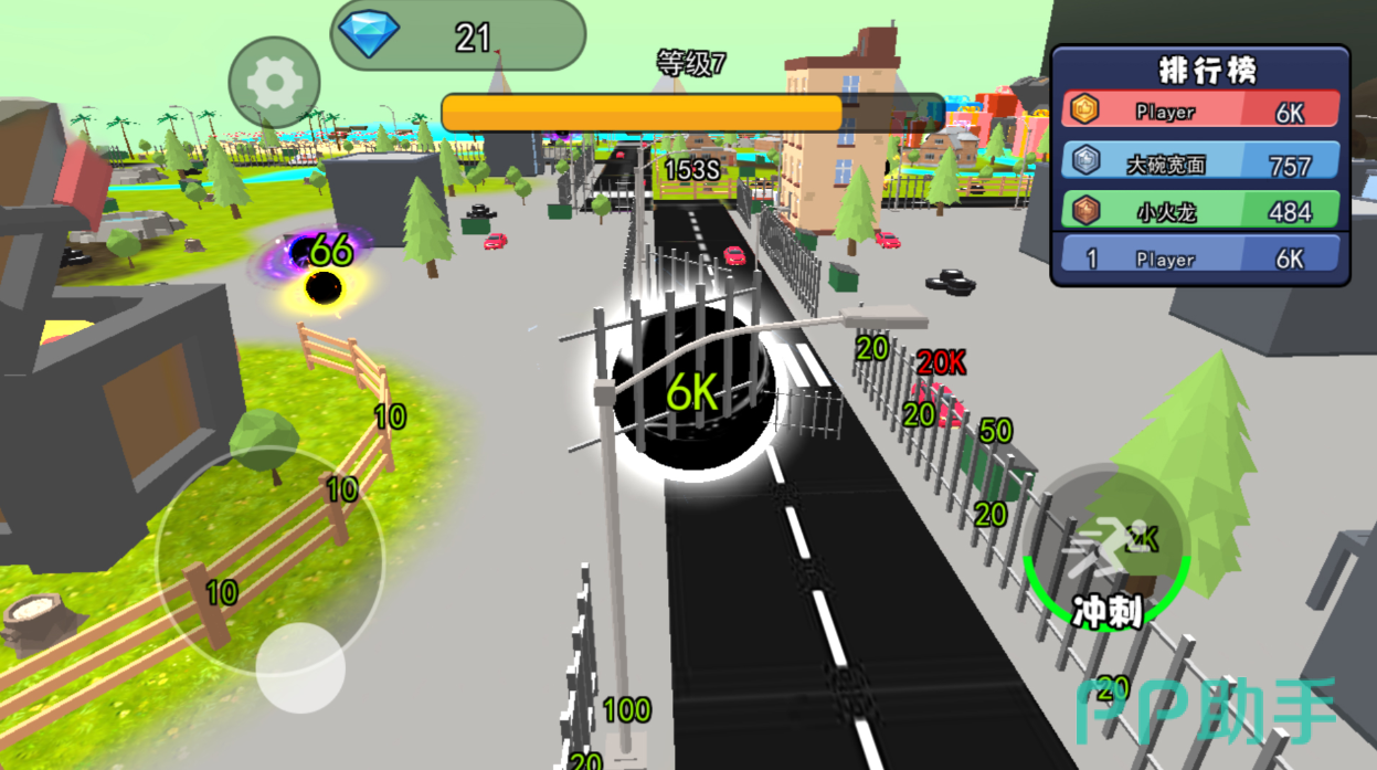 此款游戏促使你置身在小镇里,你可以从小镇里的小石头开始吞噬,变大点就可以吞噬树木乃至建筑物,到时候整个小镇都会沦为你的养料,这个过程是限时的,才考验你的手速。游戏里,还会有其他黑洞的存在,你需要躲避比你大的黑洞,否则即刻死亡,待到你自身壮大,就可以反吞噬其他黑洞,你会彻底了解适者生存、劣者淘汰的法则。