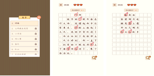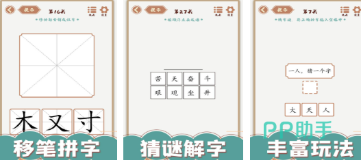 这款闯关游戏主要是通过简单的笔画开始,一步一步就可以合成复杂的汉字,享受阶梯式成长感。其中会包括填字,接龙以及猜字等多种玩法,内容相对而言一点都不会单调,并且还会有实时标注读音,组词造句,可以全方位的吃透每一个字。对于新手而言,在体验这款游戏时没有什么太大的压力,所以大家都可以去体验一下。