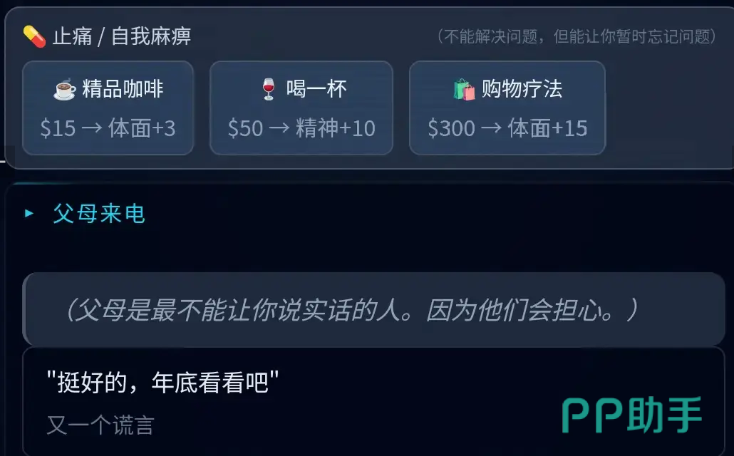 游戏机制进一步延伸至社会信用维度——当“体面值”低于阈值时,将直接影响求职面试资格,并可能触发签证失效风险,导致身份异常,进而牵涉家庭责任履行与代际关系张力。这种对现实生存规则的系统化映射,使玩家得以沉浸式体验当代职场人的多重压力源。