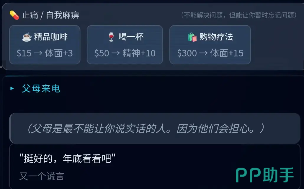 系统机制进一步深化社会规则模拟——当角色“体面值”低于阈值时,将直接影响求职面试资格;签证状态亦会随时间推移动态变化,若未能及时续签,可能触发黑户判定。在此前提下,玩家还需协调家庭关系、应对父母期望,多维压力交织,真实复刻当代职场人群的生存图景。