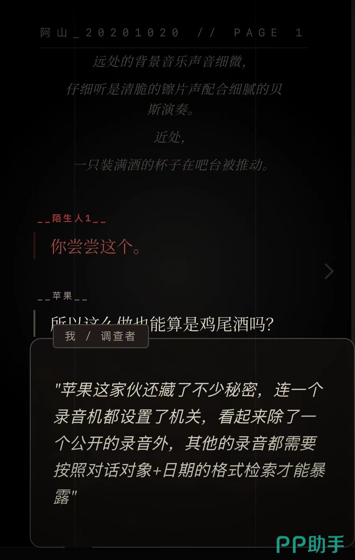 本作采用黑白胶片视觉风格,融合复古酒吧场景设定,构建出极具质感的沉浸式叙事空间。剧情采用三条独立线索并行推进、交叉印证的设计逻辑,节奏舒缓但信息密度极高,整体体验近似阅读一部结构严谨的本格派推理短篇。通关时长约为2.5小时,但由于线索环环相扣、细节伏笔密集,实际回味与复盘时间远超流程本身。游戏难度定位适中:关键线索词均设有视觉提示,系统自动归档已阅内容,免去重复翻查之扰;唯部分照片类谜题含抽象隐喻,需结合上下文反复推敲——其余所有解谜环节均遵循严密逻辑闭环,无刻意误导设计,对初次接触该类型的玩家极为友好。