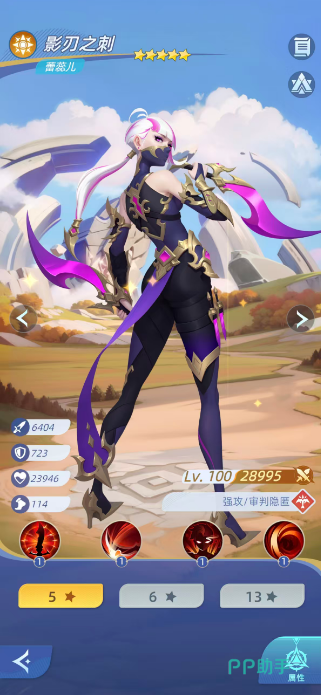 输出端首选影刃之刺(蕾蕊儿)。作为高精度单体刺客,她以“审判”为核心机制:命中敌方低血量目标后,使其受到伤害提升20%,防御降低20%;后续攻击可造成298%倍率伤害,并附加90%攻击力的真实伤害。若成功击杀,审判效果可再次触发(输出衰减至原值50%),形成连续斩杀链。该特性使其成为破防、压血、收尾三位一体的关键输出手。