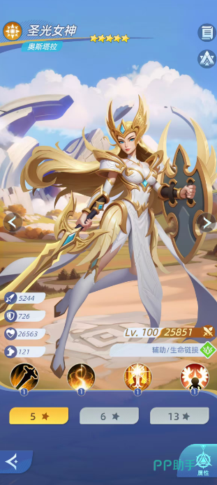 第二辅助位推荐圣光女神。她不依赖传统治疗量,而是以“灵魂链接”构建战术纽带——自动连接我方当前生命最低与攻击力最高的单位,为其恢复相当于攻击值156%的生命,并附加稳定减伤。该技能与复生天使形成互补:前者保障单点极限生存与资源转化,后者支撑群体状态与链式增益,共同构筑不可中断的辅助网络。