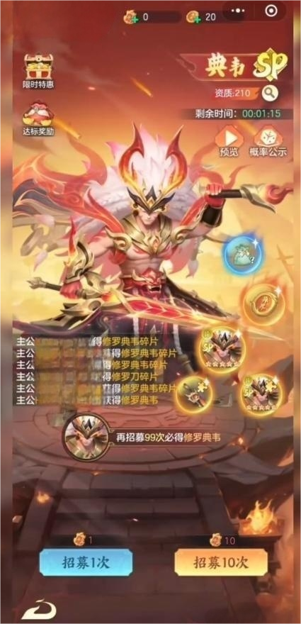 当前版本中,SP典韦为全服公认的强度标杆,其个体资质固定为210,但无法通过常规抽卡直接获得,必须通过碎片合成解锁。官方会配合节点活动开放特惠兑换通道,阶段性发放专属碎片,但整体所需资源量庞大,对玩家资源管理能力提出较高要求。