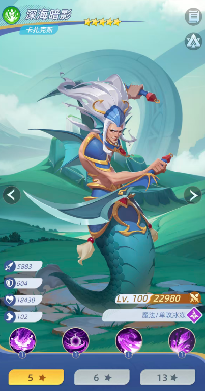 第二个给他搭配的就是深海暗影,也叫做卡扎克斯,这个角色目前在能力效果上面更适合走单攻冰冻能力,目前的卡扎克斯技能效果当中,大家经常会使用到的是水窒,这个技能让他对单体的敌人可以发起一部分的冰冻能力,并且在此时也可以造成269%的伤害,但是它造成冰冻的概率一开始是比较低的,只有50%的概率,一直到技能提升到3级之后自身伤害提升,冰冻达到的概率也有80%,而他比较强的其实是在输出效果上面,后期是有异化能力,可以进行强化,还有一定的驱散,可以保证不被对面的负面能力影响,而他最后的破冰得到一定强化增长之后,这个角色也是可以在阵容当中保证冰冻队的输出。