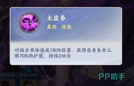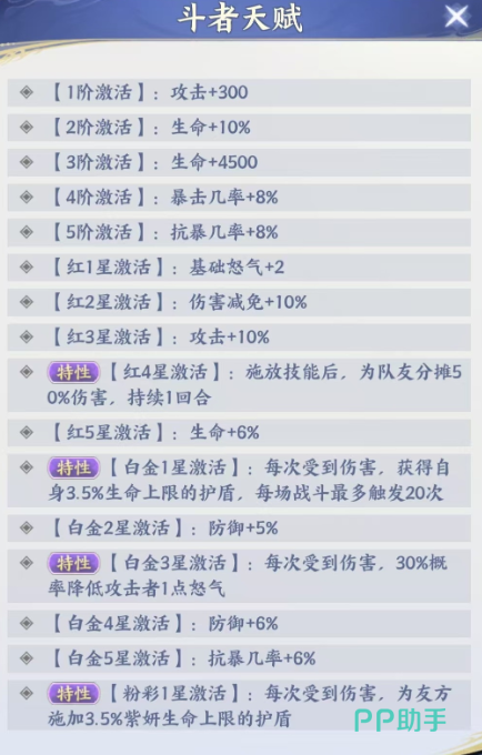 同样在这个太虚拳的初始技能当中,紫研除了基础的伤害数值之外,同时可以根据自身的生命数值带来70%的护盾,在后期持续两个回合的时间当中,都是可以给自身带来一定的保的护,所以放在游戏当中这个技能是她整体战术的一个核心用法,后期在天赋可以进行加成的情况下,带来的关键能力也会更多一些,在天赋升星的时候,她前期的五阶几乎基本都是带来的生命,还有暴击以及抗爆上面的百分比加成,而后期达到红星激活的话也是有怒气增加以及界面效果的,当然紫研最高一个特性的效果在触发的时候是在红色星进行激活,在释放技能之后,她达到红四星强度就可以为队友分担50%的伤害了,虽然只有一个回合,但是这个技能针对我方的一些脆皮输出角色来说绝对是非常需要的,而另外紫研达到白金一星的时候,可以激活的能力是每一次受到敌人伤害,她就可以获得自身3.5%的生命上限护盾效果,放在这里的话紫研可以带来的护盾虽然比较低,但是这个能力是在每场战斗当中可以触发到20次的,所以在叠加起来之后,这个角色能够带来的护盾也是非常高的。