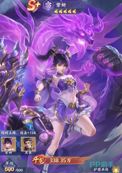 如果大家喜欢玩紫研的话,就会发现其实她在雷元素的各类卡牌当中具有的品质是比较高的,达到S+品质的时候,她目前也更适合站在前排,因为有一定的护盾能力可以召唤出来,在上阵的时候大家要注意,她也是给可以跟其他的角色放在一起进行搭配使用,这里如果能够跟黑擎放在一起使用的话,同时上阵触发羁绊就可以带来攻击增加15%的效果了,所以在稀有度非常高的同时,她在自身的能力效果当中为团队带来的伤害分摊也比较高,技能效果当中紫研有一个太极拳的技能,使用这个技能可以快速带来单体的爆发,此时进行输出的话,对敌人的单个目标,可以造成180%的伤害数值,而且在天赋系统激活了之后,紫研是同样也可以提升这个普攻的攻击能力,所以对于输出强度来说,她目前可以提升到的百分比也是比较高的。