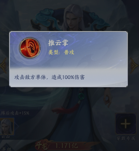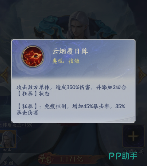 那么作为风属性当中的一位品质比较高的角色,云山的基础能力大家也不要忽视,比如说推云掌,他进行使用的时候可以带来基础输出能力,这里物理伤害比较简单,但是一般情况下都不会被敌人给闪避掉,那么他的核心技能叫做云烟覆日阵,利用这个技能的话,他可以也是可以锁定敌方的单体敌人进行输出,这里造成了360%的伤害,之后他还可以添加两个回合的狂暴状态,在狂暴状态中的单位是直接免疫控制的,敌方如果走的是控制阵容的话,那么这个技能是绝对可以起到非常大的作用,而且还可以带来360%的伤害。在增加了45%的暴击概率之后,他如果产生伤害的话,那么这里暴击的伤害数值也会提升35%,放在这里使用的话,他自身绝对是可以短时间之内完成各种收割动作的,所以云山放在这里使用的话,他绝对是一个风系里面最注重物理攻击能力的角色,而且他虽然没有其他类型的输出,但是后期能够给敌人带来的各种压制能力还是非常多的,所以在打击效果上面,其实大家后期也是可以通过一部分的阵容搭配来补充他的弱点,目前打造单体无伤效果的话,那么在上阵之后可以达到的攻击也会有15%的加成,所以在触发了羁绊之后,云山这个角色是非常适合大家用在物理队当中进行使用的。