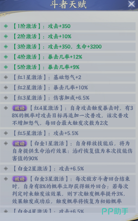前期大家也可以尝试去将云山培养起来,因为后期他在斗者天赋上面也会有更多的能力可以进行提升,不管是高爆发定位能力的效果,还是后期走强续航的一些阵容能力,都可以让他有足够的成长培养上限,从一阶到五阶的话,他的各种天赋激活都会为他带来攻击能力以及暴击概率上面的提升,特别是在武器激活了天赋之后,他的暴击概率直接达到了9%,而在后期进行红星激活的同时,被动能力在红四星的时候就可以激活,此时他自身攻击能力触发了一定暴击的时候会有38%的概率可以触发一次追加的攻击,虽然这一次施加的是普攻,但是他每一个回合里面是有两次机会可以触发这个被动追击效果的,放在这里的话,同样也是可以为他带来更多行动的概率。