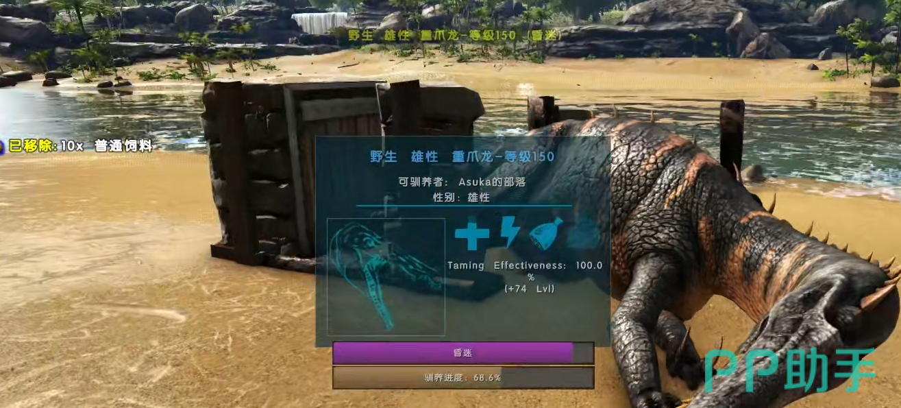 驯服难度属于中低档位。推荐使用5–50支麻醉箭进行初始击晕,因其眩晕值成长系数较低,单次命中效率高。若采用投喂式驯服,完全无需额外麻醉药剂:首选厚鼻龙蛋制作的饲料,驯服效率提升40%;次选优质生鱼肉(驯服效率为饲料的85%);再次为优质熟鱼肉(65%);最低效为普通生鱼肉(仅45%)。安全捕获方式有两种:其一,使用流星锤命中后限制行动,再持续射击麻醉箭;其二,召唤阿根廷巨鹰(Argentavis)进行空中抓捕,将其运送至封闭驯养区后投喂优质生鱼肉,全程规避地面冲突风险。