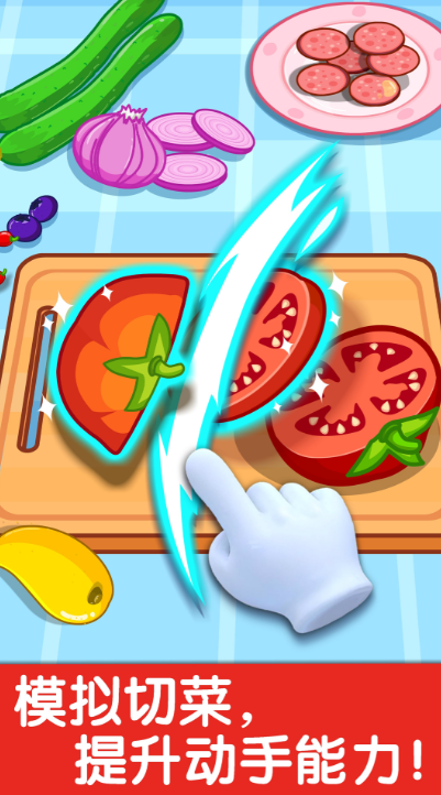模拟厨房操作全流程,涵盖清洗蔬菜、切配食材、翻炒装盘等步骤。胡萝卜、西红柿、鸡蛋等常见食材以高饱和度色块呈现,形态辨识度高。每步操作均有清晰图标指引与简短语音提示(如“搓一搓”“按一下锅铲”),支持零理解门槛上手。系统自动记录已操作食材,帮助孩子逐步构建食物名称、外形与用途的认知图谱,在趣味实践中同步发展精细动作与感官统合能力。