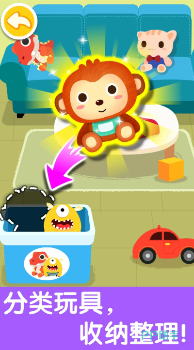 本作以家庭真实生活场景为蓝本,还原卧室、客厅等熟悉空间。毛绒玩具、小水杯、绘本等日常物品造型圆润、色彩明快,符合婴幼儿视觉偏好。孩子通过将物品拖入对应收纳区域完成分类任务,每次正确归位均伴有柔和光效与正向语音反馈(如“真棒!”“放对啦!”)。长期游玩有助于建立初步的秩序感与物品归属概念,潜移默化培养自主整理意识和基础生活自理能力。