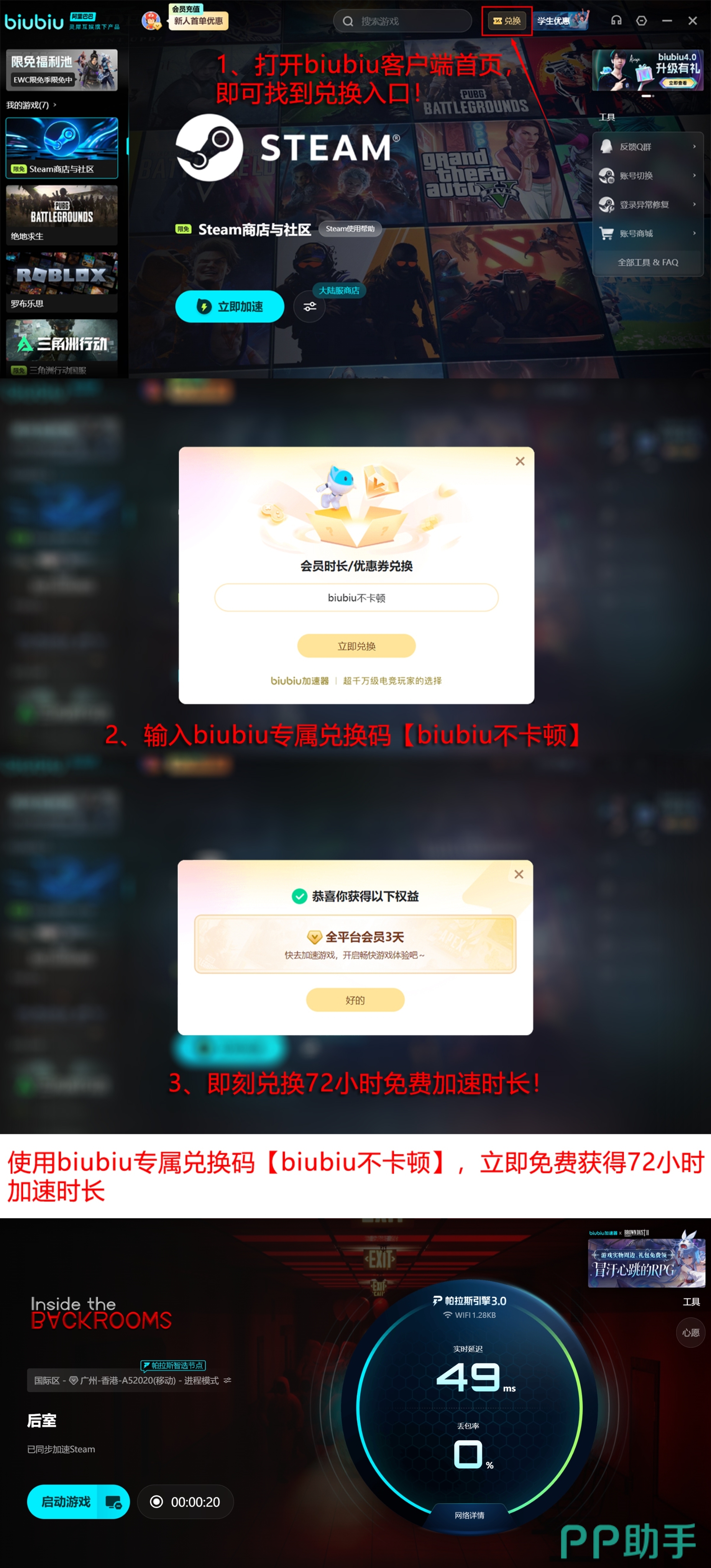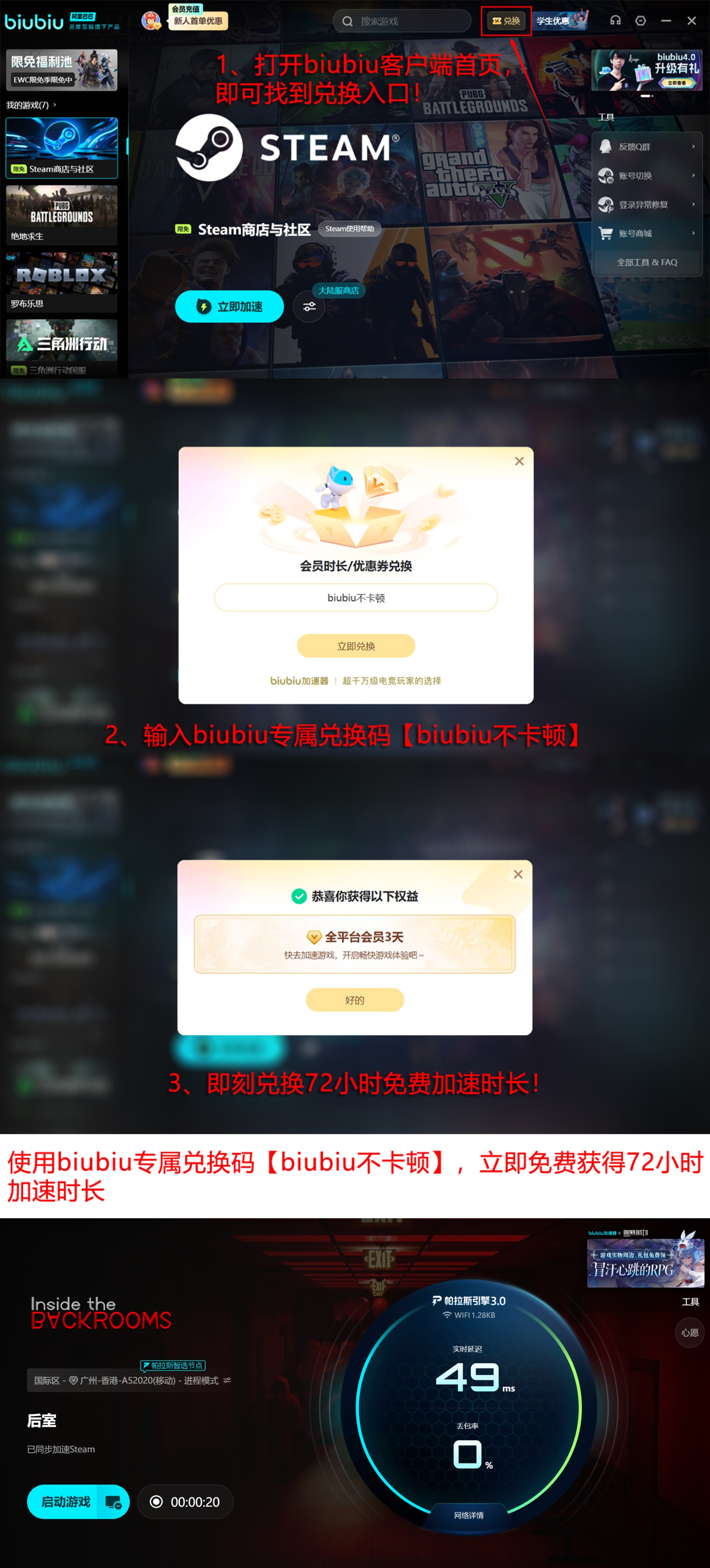 为降低体验门槛,biubiu加速器提供无条件试用支持:新注册用户自动获赠24小时全游戏免费加速权限。输入专属口令【biubiu不卡顿】,所有用户(含已注册账号)均可额外领取72小时加速时长,无需绑定支付方式。