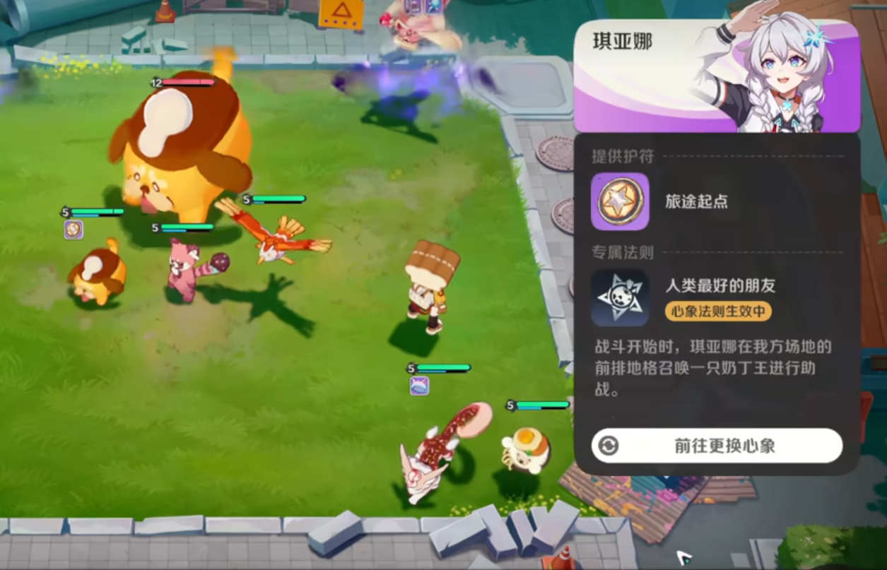琪亚娜的专属护符是“旅途起点”,其效果为“为装备者提供35护甲和35魔抗,使装备者的生命值上限提高,提高的数值相当于装备者自身护甲和魔抗的数值之和”,虽然看似并不强力,但作为前期过渡的专属护符来说,其效果正如其名“旅途起点”,在前期我们的精灵普遍等级不高的前提下能为我们提供不俗的生存能力,可以说是非常好用了!而其专属法则“人类最好的朋友”则更是重量级,其效果为“战斗开始的时候,如果可以,琪亚娜会在我方场地的前排地格上,召唤一只奶丁王协助我们作战”,而且最主要的事这个召唤出来的宠物是不吃人口上限的!也就是说我们能直接在前期白嫖一个精灵位,并且其数值也是“奶丁汪”的2倍左右,可以说是非常强力了。