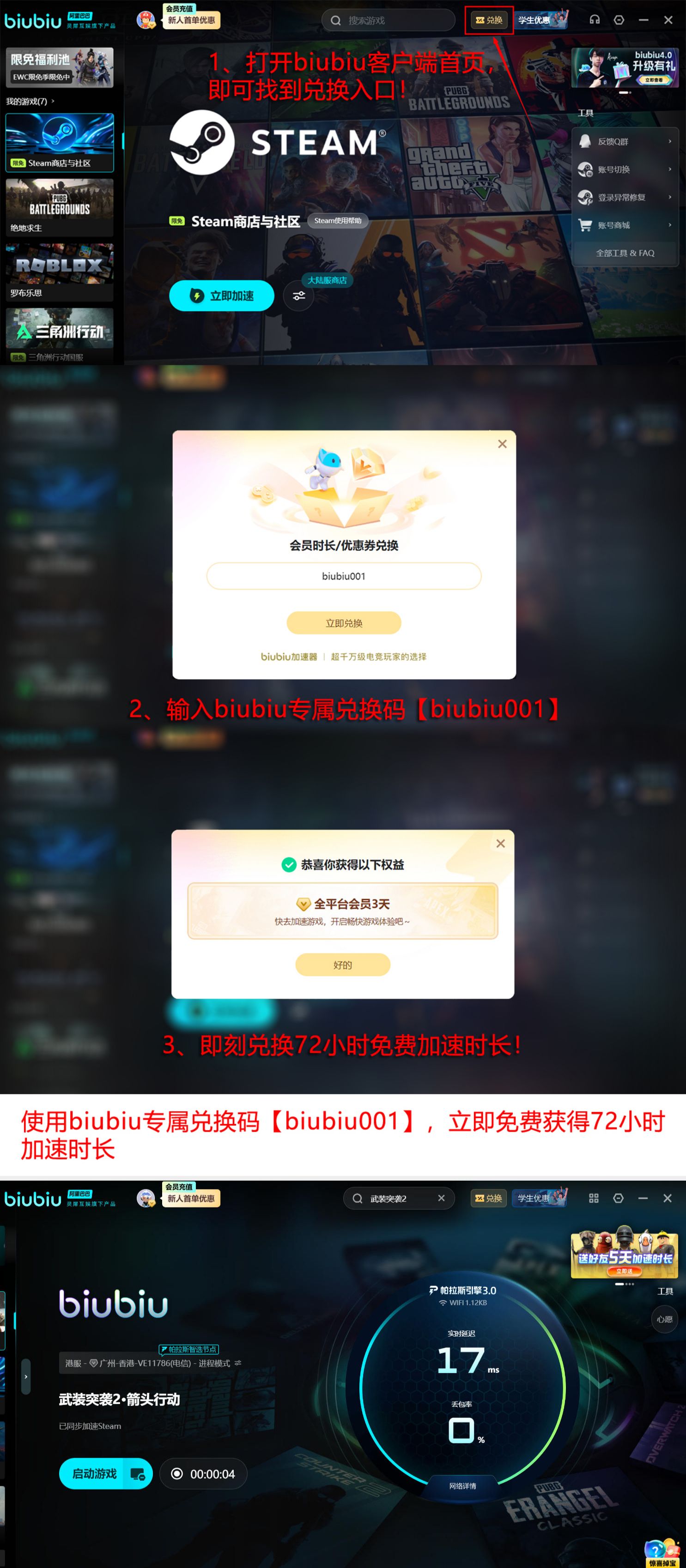 该工具已通过多轮高强度竞技环境压力测试,涵盖百人级战术对抗、长时连续载具协同等典型用例,并获得职业电竞选手小叮当在公开直播中的实际验证与推荐。针对用户关注的使用成本问题,平台提供总计96小时免费加速时长:新注册用户自动获赠24小时基础权益;另可通过输入激活码【biubiu001】额外领取连续三天(72小时)专属加速服务,全程无需绑定支付方式。