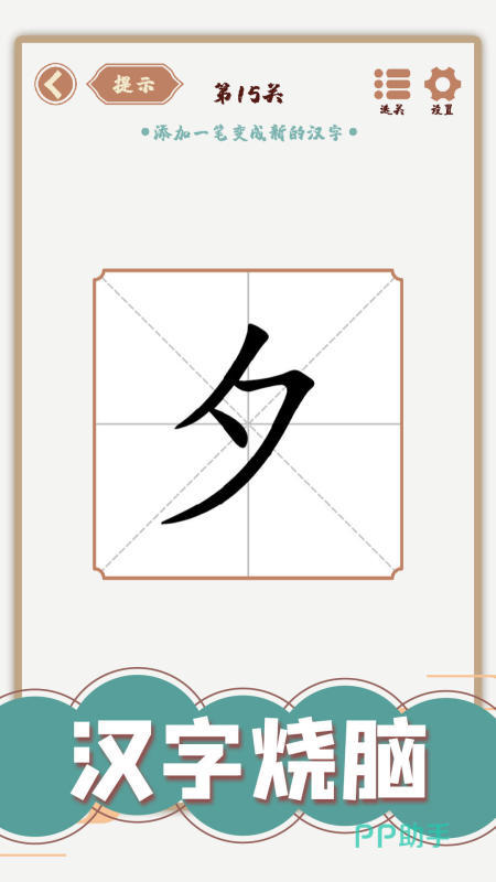 游戏的界面非常的简约,这样大家才能够全神贯注的投入到游戏中,添加一笔就能够成为新的文字了,大家在了解了游戏的规则之后,就可以开启闯关了。在游戏进行过程中可以放松心情,操作也是非常的简单,直接点击屏幕就可以了,完成关卡之后还能够获得星星,随着星星数量的增加,游戏的等级也在不断的增加着。