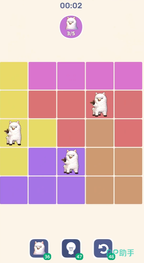 作为一款以纯粹逻辑为核心的解谜作品,《放置羊驼》采用标准网格棋盘,格子按颜色分区。玩家需严格遵守三大约束条件:每行、每列及每种颜色区域内均仅允许放置一只羊驼;所有羊驼之间不得相邻——包括上下、左右及四个对角方向。在无随机元素、无运气干扰的前提下,每个关卡都存在唯一解,全部可通过严谨推理得出。