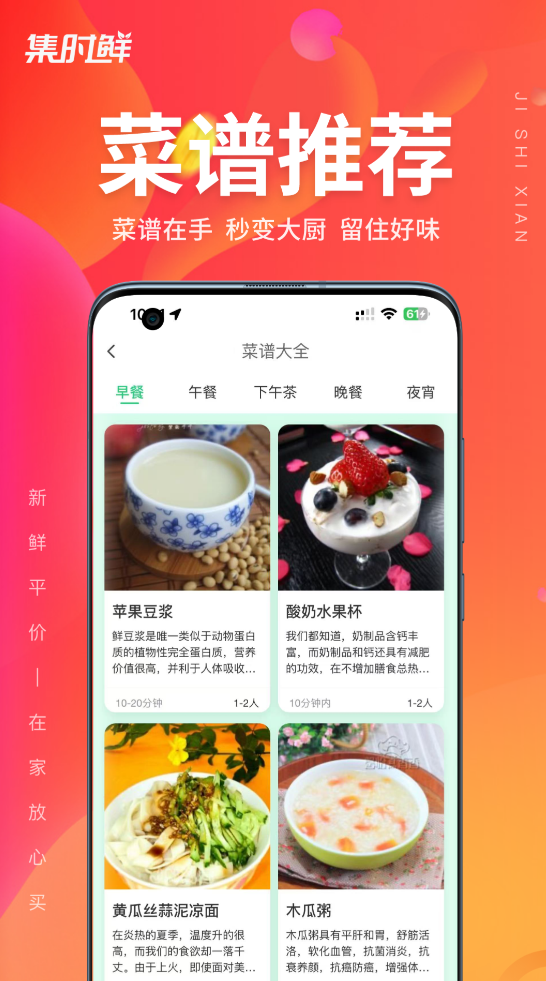 当日买菜半个小时就能送到,即便是活海鲜、新蔬菜都能极速配送,有独立的配送资源平台,就算是早晚高峰配送速度一样快,对生鲜类产品更有“不新鲜包赔”服务,平台内还能直接跟随菜谱去买菜,菜谱里需要什么菜直接会帮你一键下单,也让做饭有了个联动。