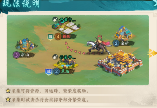 玩法结构划分为五大功能模块,各具策略侧重: 第一,野外资源采集。地图中任意资源点可同步获取基础资源、国运珠及繁荣度三项收益。需注意——遭遇敌对玩家攻击将导致当前携带繁荣度按比例流失,建议组队采集或选择安全时段行动。