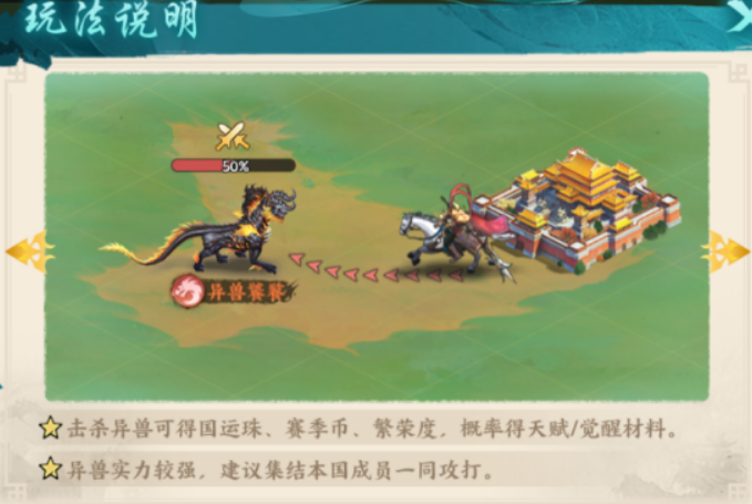 第三,异兽围猎。该目标拥有较高单体强度,不推荐 solo 挑战。成功击败后可获得国运珠、赛季币、繁荣度,并有概率掉落角色天赋材料与觉醒关键道具。强烈建议协同本国盟友发起集结作战,提升通关稳定性与战利品获取率。