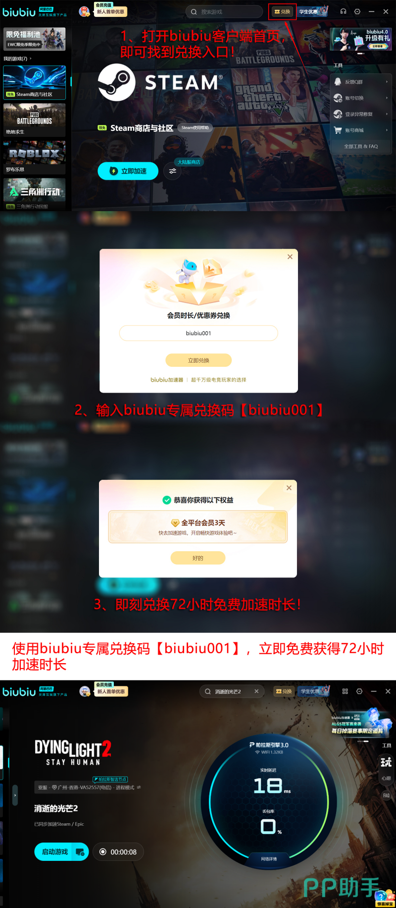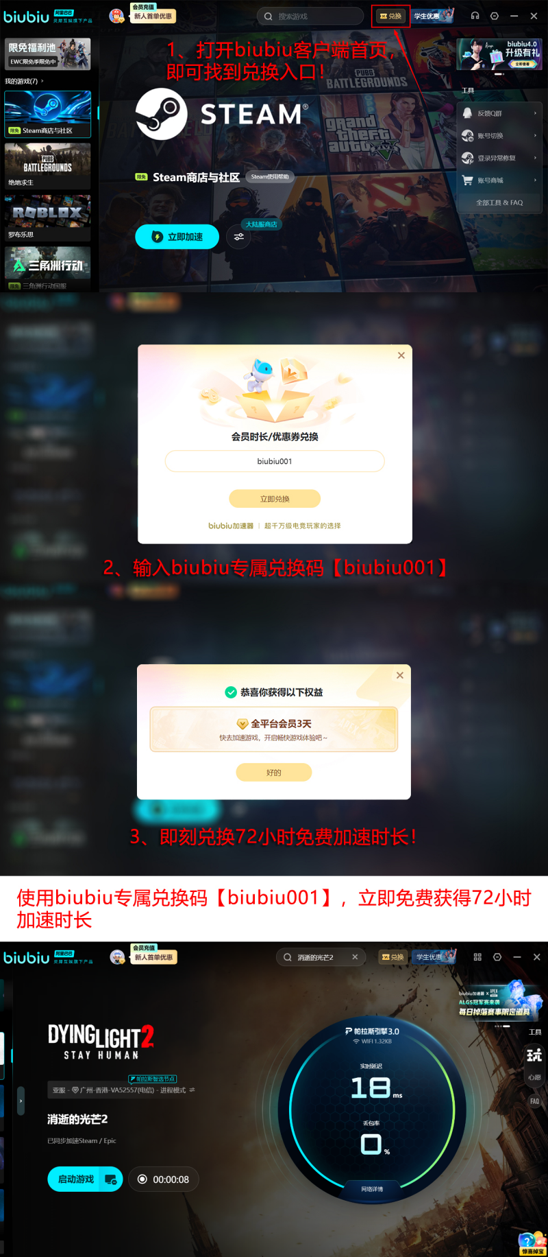 该工具已通过多项实战场景验证,曾获职业电竞选手小叮当公开推荐。操作流程极简:启动软件后,在游戏库中搜索“消逝的光芒2”,一键启用加速即可。新用户注册即赠24小时免费时长;另输入激活码【biubiu001】可额外获得三天加速权益,累计最高可享96小时无限制体验。