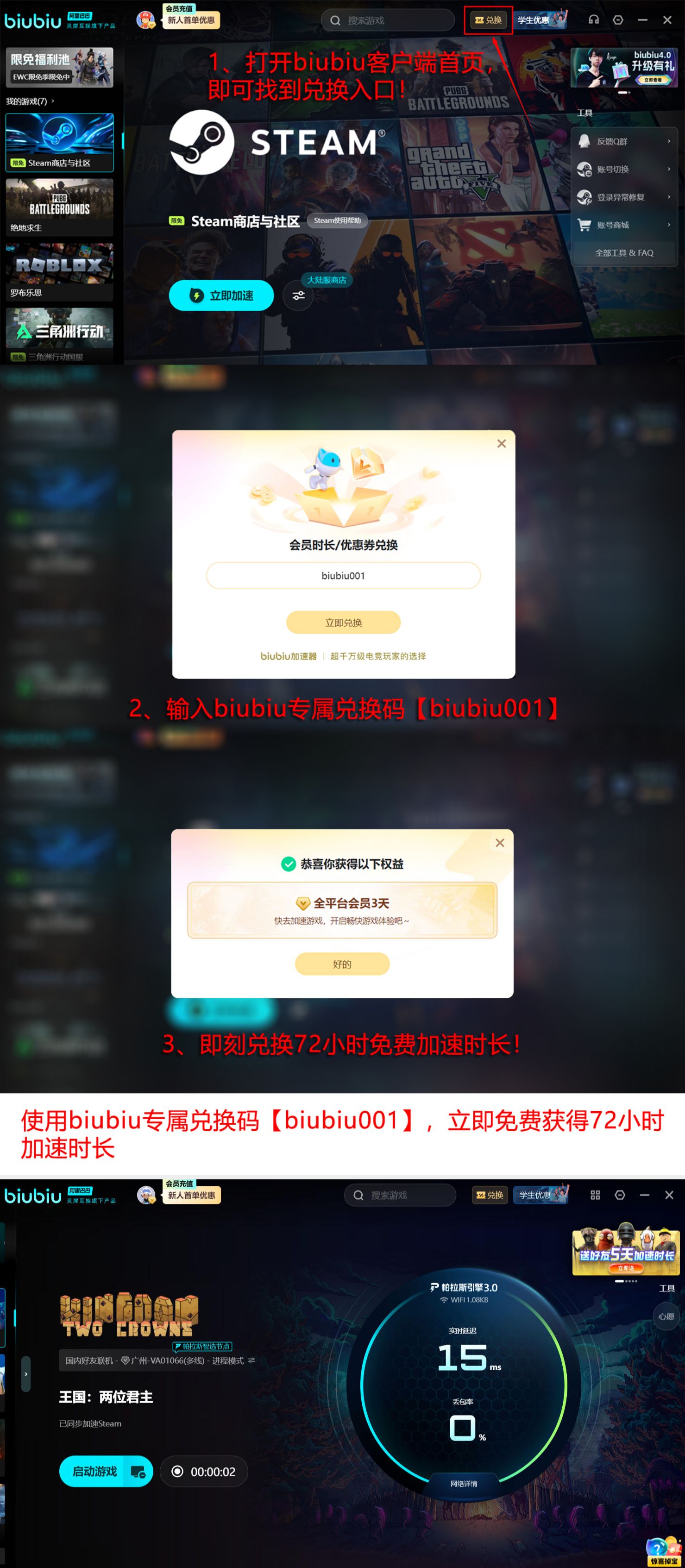 该工具由阿里巴巴灵犀互娱技术团队深度支持,集成自研帕拉斯3.0网络加速引擎,已完成重大版本迭代,在协议识别、路由调度、抗抖动等维度实现多项底层优化。当前版本支持全天候稳定服务,无论工作日晚间高峰或周末集中开黑时段,均可保障低延迟接入。新用户注册后输入激活码【biubiu001】,可即时获得三天高级权限;首次绑定账号还可额外领取24小时试用时长,累计达96小时,充分满足中长期体验需求。