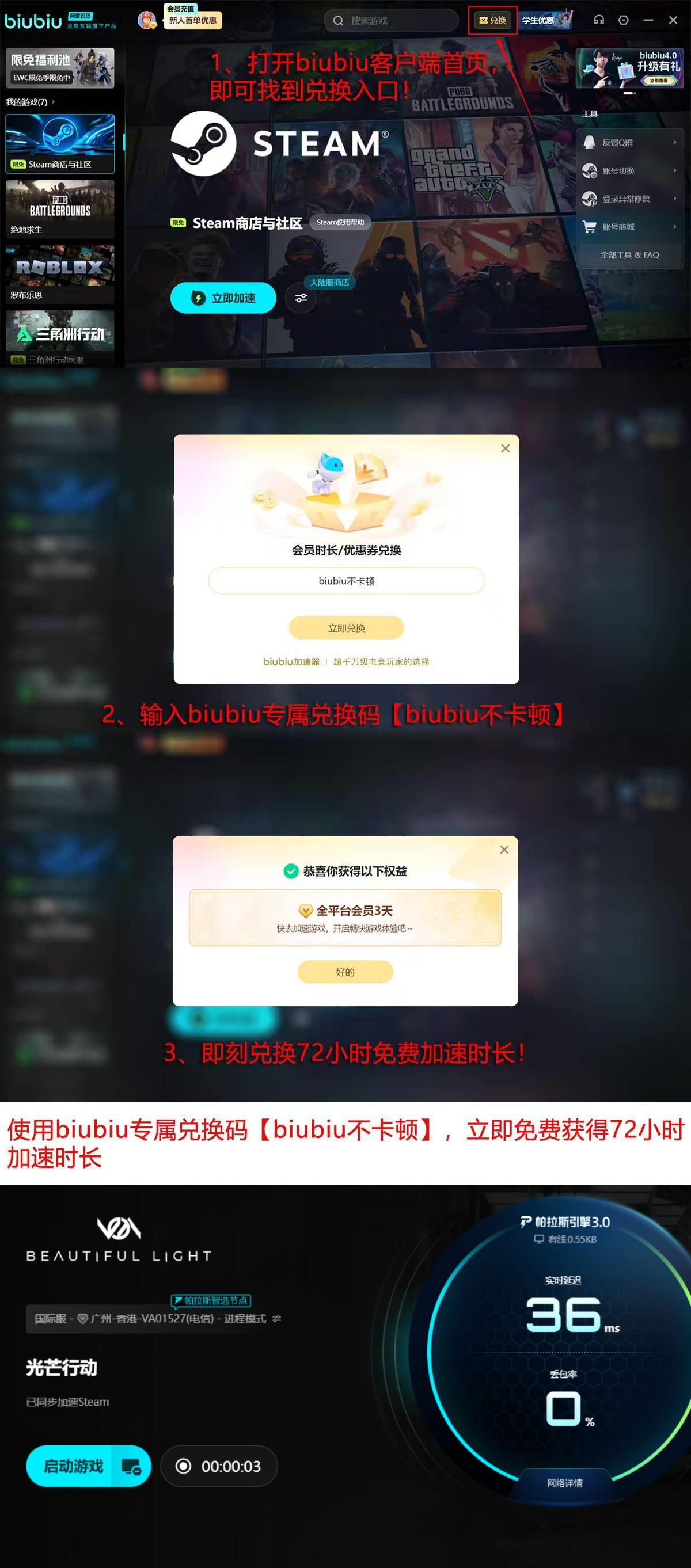 该加速工具已通过职业电竞选手小叮当全程参与的压力测试验证,并应用于其日常高强度训练环境,产品可靠性经实战检验。新注册用户可享24小时全功能加速权益;存量用户输入兑换码“biubiu不卡顿”,即可额外获赠3天高级会员服务。