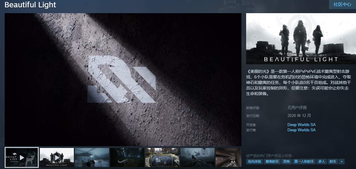 根据Steam平台官方页面显示,《光芒行动》确定将于2026年12月正式发售,即本年度年末档期。届时玩家可于Steam商店购买并启动游戏。核心玩法围绕“6支三人小队”展开,在充满未知威胁的封闭区域中搜寻关键目标“神石”,完成高强度对抗后执行安全撤离。过程中需同时应对环境异形单位及敌对小队的实时交火,容错率极低,强调战术协同与瞬时决策能力。