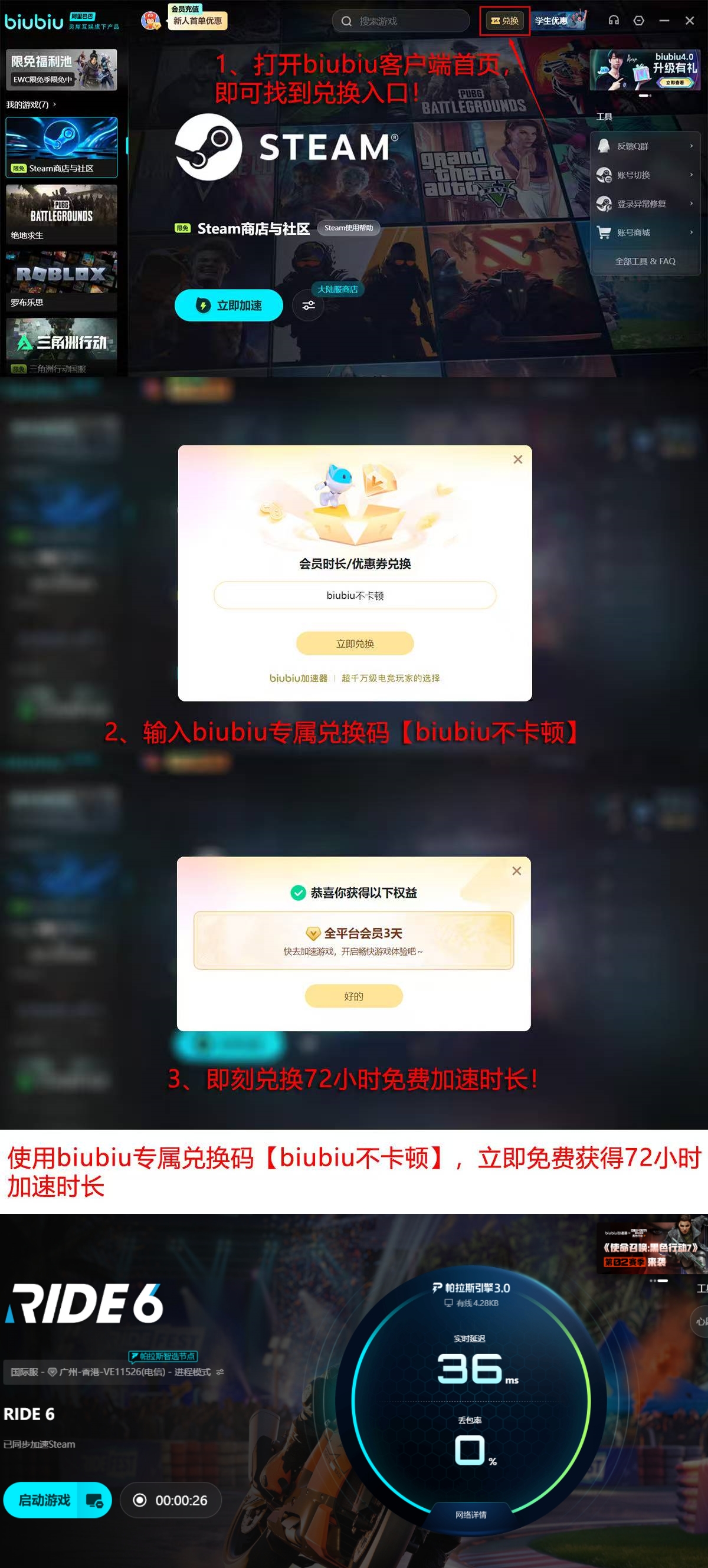 当前biubiu加速器同步上线多项限时福利:输入兑换码【biubiu不卡顿】可激活72小时连续使用权限;新用户完成注册后还可额外获赠24小时免费体验时长。两项权益叠加,最高可享96小时无门槛加速服务,覆盖完整首周试玩周期。