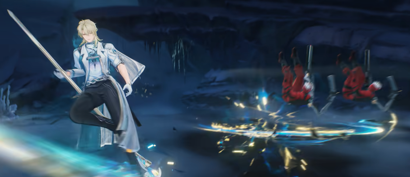 陆赫斯的普通攻击叫做"光犹如此",地面上最多打四段,伤害类型是衍射。这四段里面有个细节要注意,第三段打出去会带一个飞刃,飞刃本身不造成伤害,要等第四段攻击的时候才会引爆。但是如果打到一半用了别的技能,飞刃就消失了,所以用普攻的时候最好把这一套打完。重击是跳起来砸下去,消耗耐力,造成衍射伤害。空中攻击稍微复杂一些,分四段,第四段是空中下落攻击,也要消耗耐力。空中第二段和第三段有点特殊,短按普攻和短按跳跃会打出不同的动作,用普攻打是"镰刀·剖解",用跳跃打是"镰刀·裁断",后者还会给敌人加一个叫做"集谐·偏移"的状态,持续25秒。