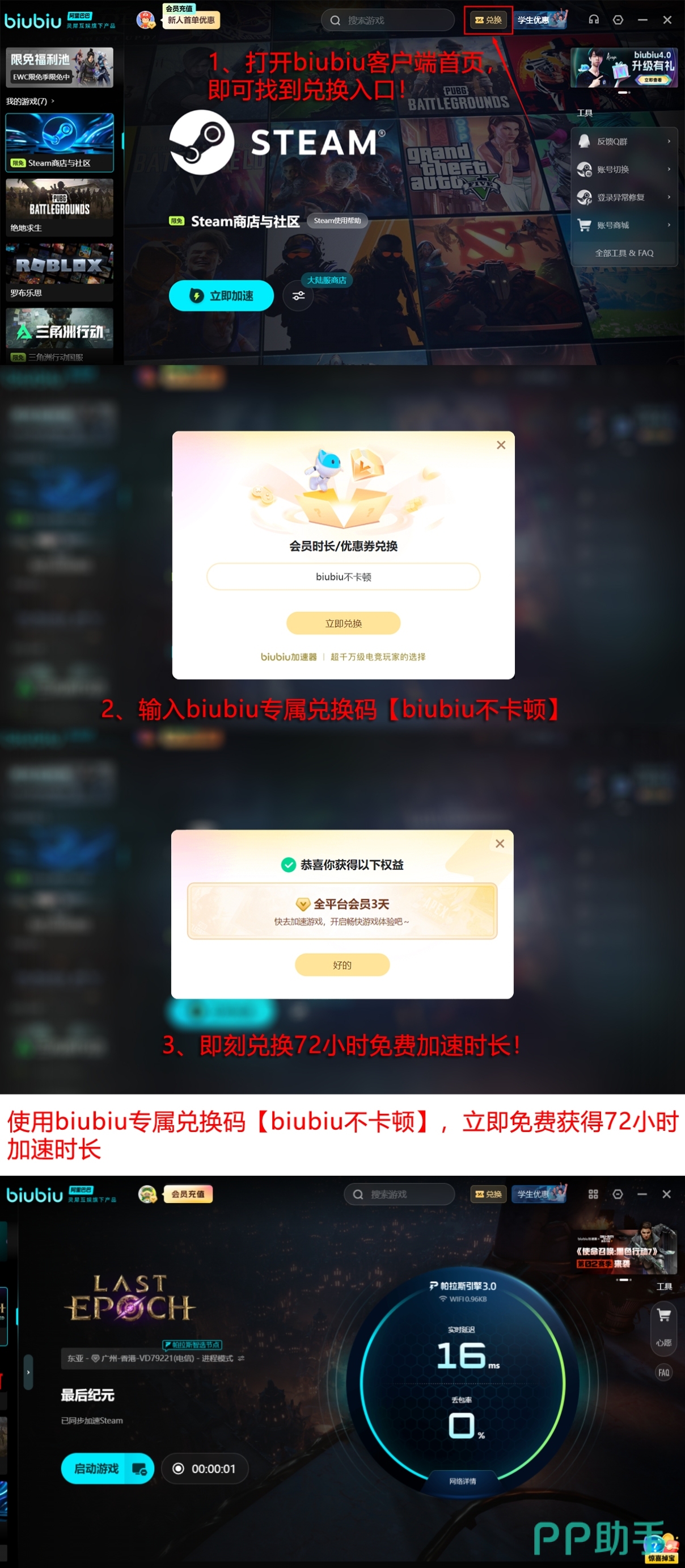 针对新用户,biubiu提供无门槛试用机制:首次注册即可领取24小时全游戏免费加速时长;同时面向所有活跃用户开放限时福利:输入口令【biubiu不卡顿】可额外获得72小时加速权益。新用户两项叠加可享总计96小时深度体验周期,完全覆盖《最后纪元》开荒期、赛季过渡及大型团本测试所需时长,相较按月订阅制竞品,更具实用价值与成本优势。