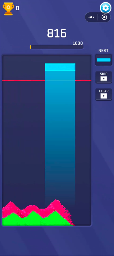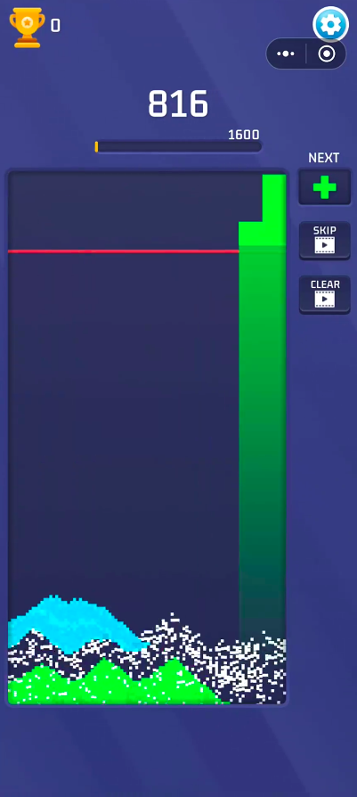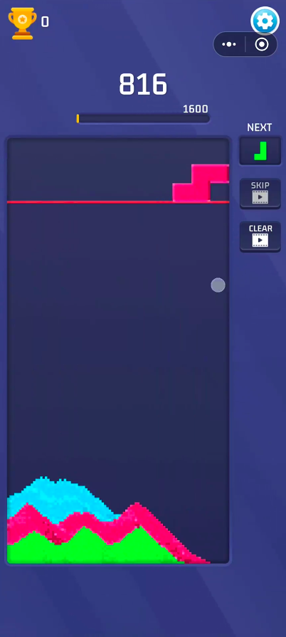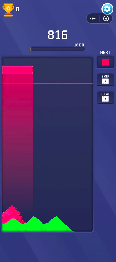 将俄罗斯方块内容和极具复古情怀的像素风风格相融合,将俄罗斯方块内容和极具复古情怀的像素风风格相融合,加入了Blast元素,玩家可控制红黄蓝绿四种不同颜色的方块进行随机掉落,在画面中每一横行有三个模拟槽位点,当相同颜色的流沙落入同行列的槽位点后,则可自动消除并触发Blast特效,自此可完成分数增值。