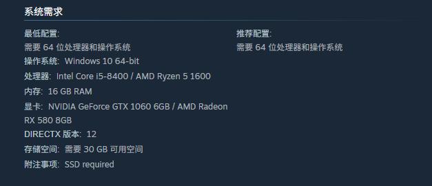 根据Steam平台当前公开信息,《索拉斯塔2》暂未公布推荐配置,仅列出了最低运行要求:操作系统需为64位Windows 10;处理器最低为Intel Core i5-8400或同等级AMD Ryzen 5系列;内存必须达到16GB;显卡方面需配备NVIDIA GeForce GTX 1060(6GB显存满血版)或AMD Radeon RX 580(8GB显存)。该配置定位中端主流平台,未强制要求RTX显卡或高频DDR5内存,对老用户较为友好。