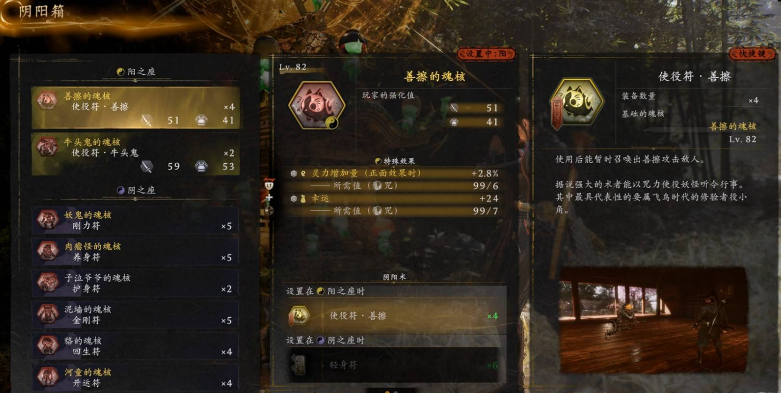 魂核是击败各类妖怪后掉落的关键成长资源,本质为封印妖怪之力的灵能结晶。玩家需在神社处的阴阳箱中进行配置:装备于阳之座时,可主动释放对应妖怪技,或召唤该妖怪协同作战;若置于阴之座,则转化为符咒效果,提供防御增益、属性抗性、状态抵抗等战术支援。魂核等级直接影响基础攻防数值加成,而稀有度则决定可激活的词条数量——高等级+高稀有度组合,是构建流派强度上限的核心要素。