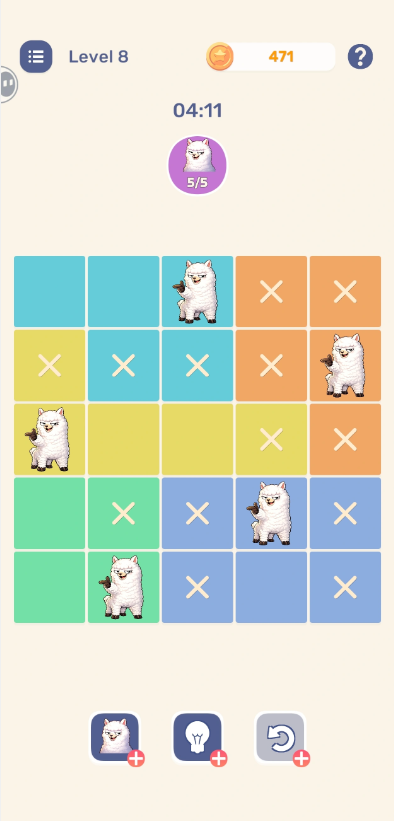 如何找到羊驼的完美位置是游戏的关键。在规则的限制之下,羊驼们只能在同样颜色的格子中出现一次,并且不能和其他的羊驼相邻。同样的,每行每列中也只能有一个羊驼存在,因此每一次的放置都需要经过慎重的考虑,每一步的前进都是逻辑思考后的结果。游戏中并不设置倒计时来制造压力环境,也不依赖各种道具来进行快速通关,更不考验反应速度,而是为玩家们提供一个沉浸式的思考氛围,让大家能够顺着自己的节奏进行思逻辑推理。在游戏过程中,玩家们所要做的事情就是不断的思考和推理,在万般可能性中找到那个唯一的解题思路,实现羊驼的完美放置。这是一种与自己博弈的乐趣,能够在成功的一瞬间获得巨大的满足感。当然了,如果你是思考大神,也可以挑战自己的脑力极限,尝试在最短的时间内找到解法,不断刷新个人记录乃至全球记录,勇夺巅峰!当然啦,游戏中也贴心的设置了一些小提示,在玩家们卡关的时候就可以合理的运用它们来帮助自己成功获胜,不过每局的帮助次数是有限的,大家可不能一味依赖哟。