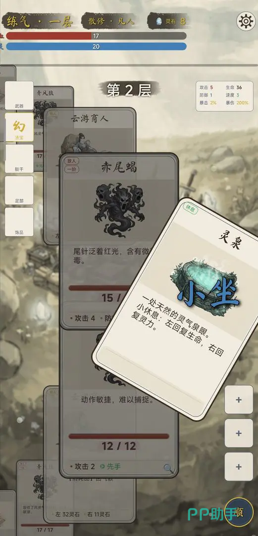 每个大境界细分为多重小层,修为进度可视化强,成长路径一目了然。战斗以卡牌驱动为核心,法术卡、符箓卡、心诀卡、灵宝卡等类型各司其职,出牌逻辑需兼顾灵力消耗、效果联动与风险规避——正确组合可叠加修为与灵石收益,失误则直接损耗生命值,策略权重极高。