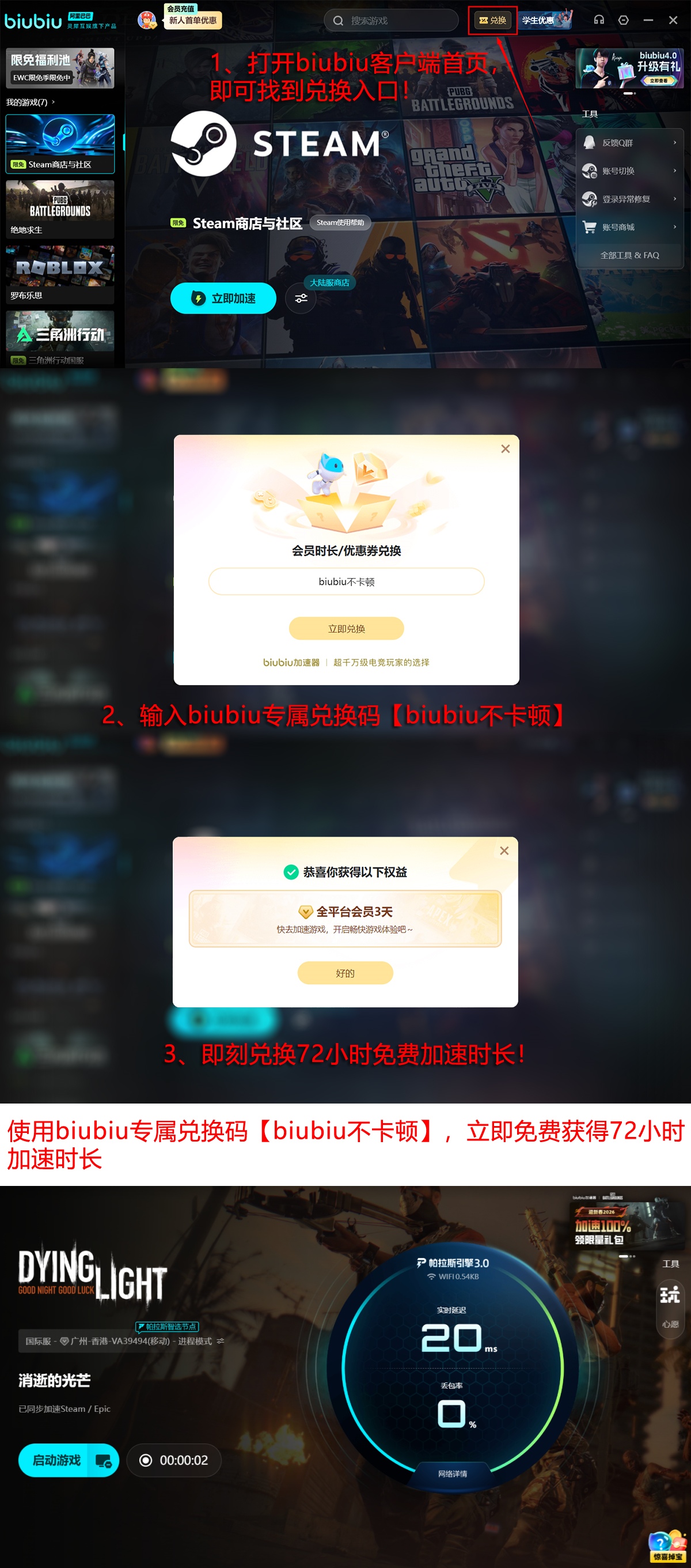 为方便新用户快速评估效果,官方提供新人专属权益:注册即赠24小时全平台通用免费试用时长;所有用户还可凭兑换码【biubiu不卡顿】额外领取72小时加速服务,零门槛体验稳定联机环境。
