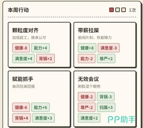 游戏采用季度制推进机制,每阶段限定行动次数,玩家需在任务接单、时间分配、突发应对、资源储备等维度进行动态权衡。例如:是否优先响应甲方紧急需求?能否协调多线程并行开发?如何平衡KPI考核与身心健康?这些设计高度还原外包从业者日常决策逻辑,兼具模拟深度与现实映射感。