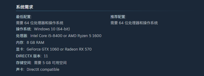 根据官方公布的系统需求,该游戏对硬件的整体压力较为温和。CPU方面,最低需配备Intel Core i5-8400;内存建议不少于8GB;显卡最低支持NVIDIA GTX 1060(6GB显存);当前安装包体积约为5GB,但为适配后续版本更新,推荐预留至少7GB可用存储空间。