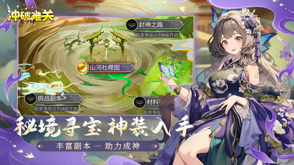 独创“秘境寻宝”玩法整合四大核心模块——封神之路、山河社稷图、挑战副本与材料关卡,覆盖资源养成、装备获取与剧情探索多重目标。高品质神装与稀有材料均可通过稳定路径获取,兼顾付费与非付费用户的成长节奏与操作体验。